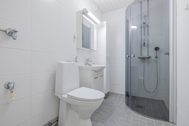 - WC-istuin, suihku, pesukoneliitäntä, lattialämmitys, peilikaappi, pesuallas, allaskaappi, bidee-suihku, ja suihkuseinä