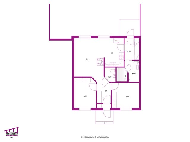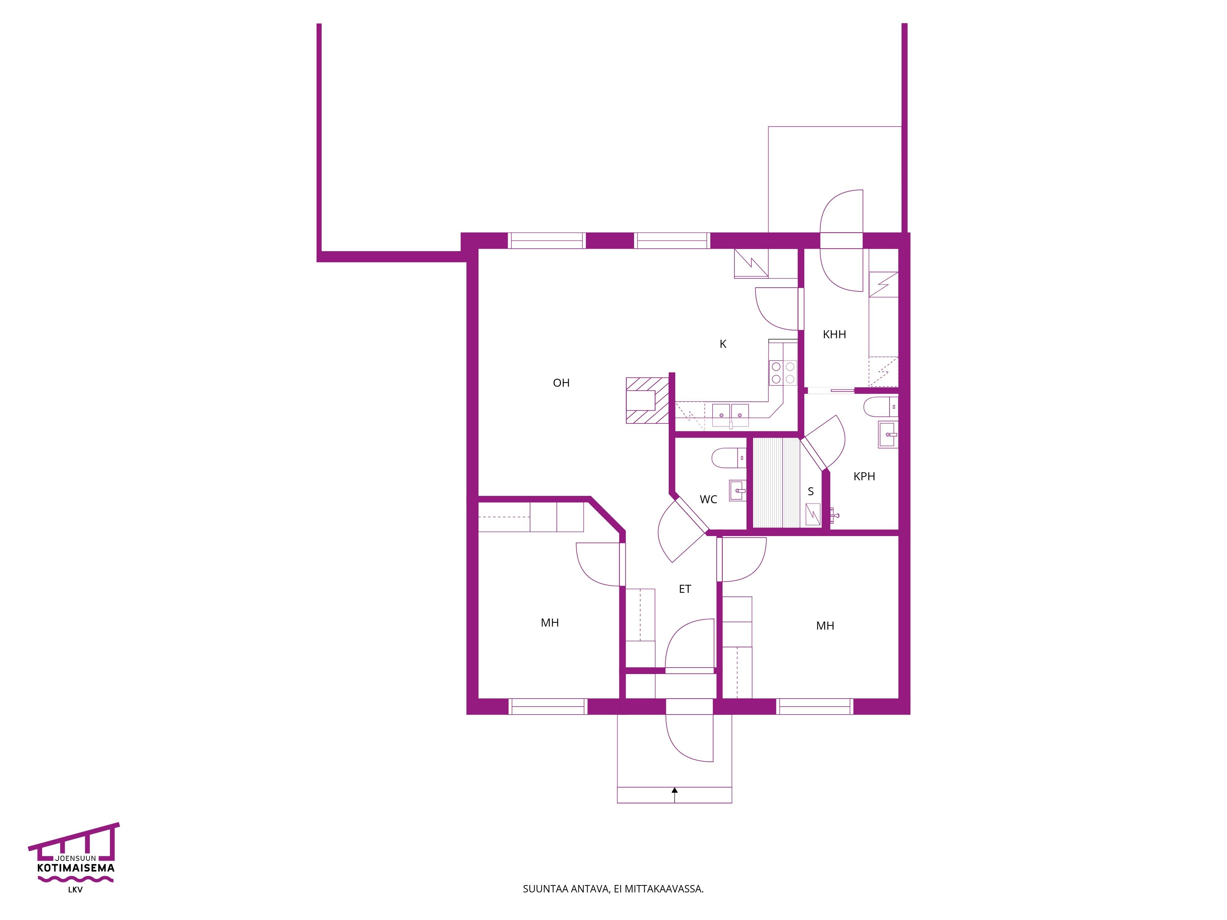 - Keittiön ja olohuoneen ikkunat etelään takapihalle. Makuuhuoneiden ikkunat pohjoiseen etupihalle.