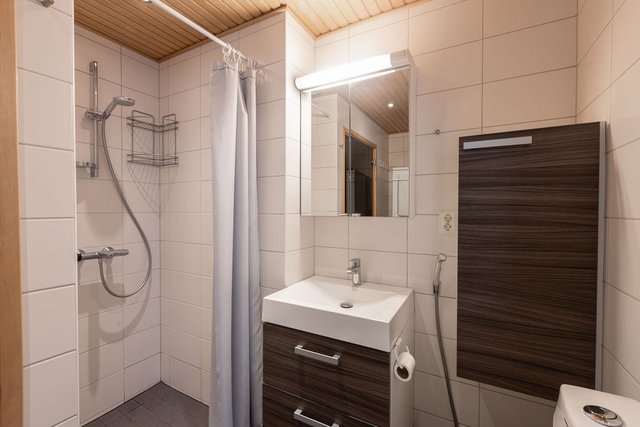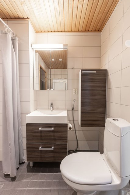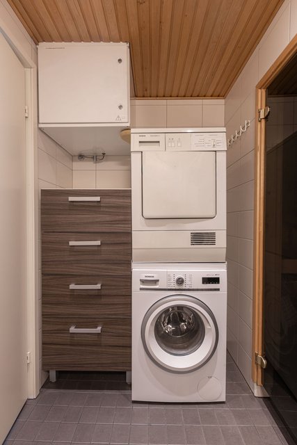 - Pesukoneliitäntä, lattialämmitys (sähköinen), wc-istuin, suihku, peilikaappi, ja allaskaappi