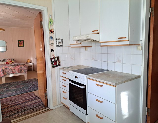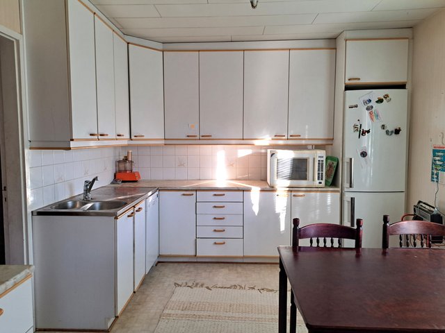 - Jääkaappipakastin (uusittava), liesi (uusittava), astianpesukone, ja liesituuletin