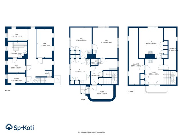 Asuink: 1mh, oh, k, wc, et, yläk: 1h, aula, kellari: kph, s, at, varastoja