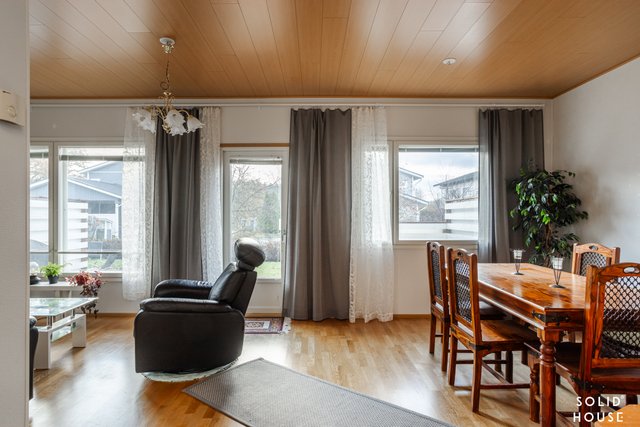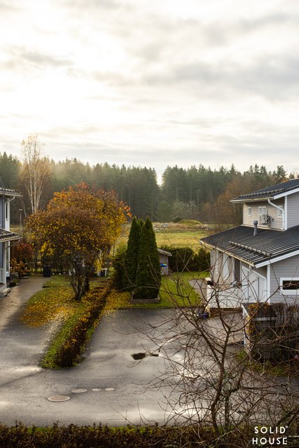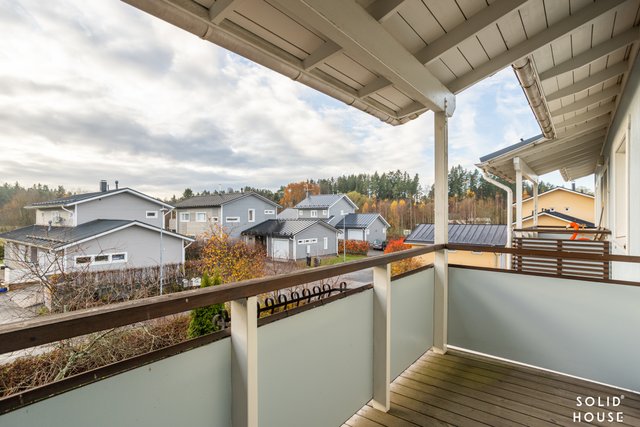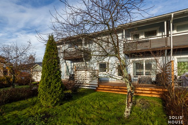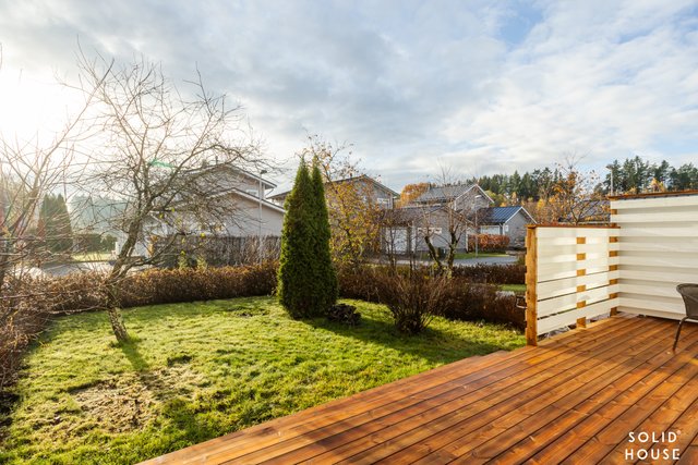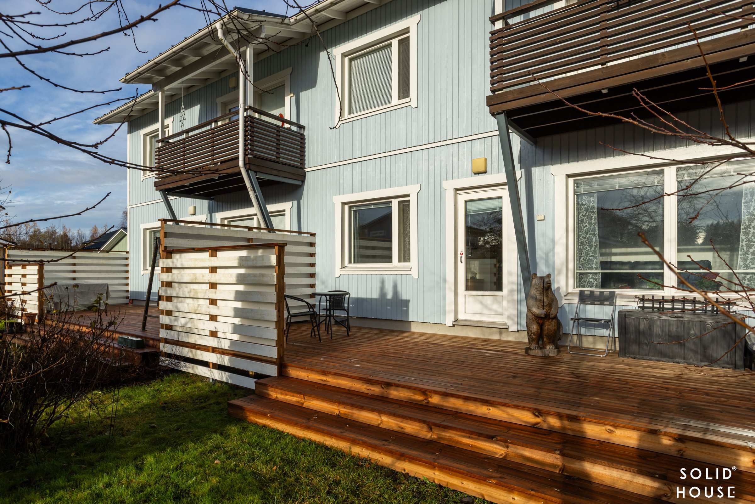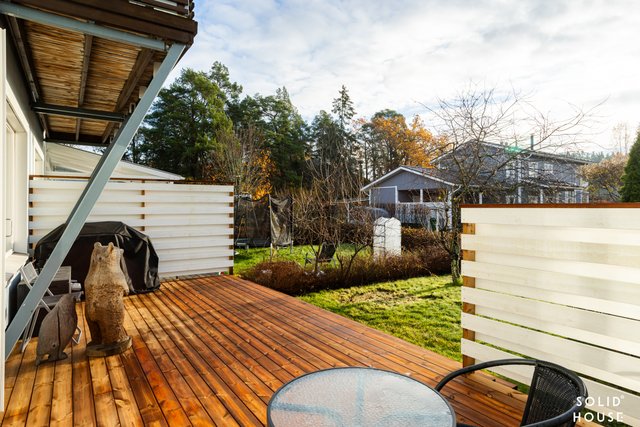 Asuntoon kuuluu juuri uusittu etelään aukeava takapihan terassi ja yläkerrassa sijaitsevien makuuhuoneiden yhteydessä löytyy parveke mikä helpottaa vuodevaatteiden tuuletusta. Yläkerrasta löytyy myös toinen kph tila sekä kodinhoitohuone arkiaskareihin. Varustelutaso on hyvä ja saunastakin löytyy alkuperäisenä mm.kuituvalaistus. Kaukolämpö ja kaikissa huoneissa lattialämmitys mikä tuntuu jalan alla mukavalta ja helpottaa sisustamista kun tilaa  rajoittavat patterit puuttuu. Huoneistokohtainen säädettävä koneellinen lämmöntalteenotolla varustettu tulo- ja poistoilmavaihtojärjestelmä sekä erillinen poistoilmapuhallin liesikuvulle.