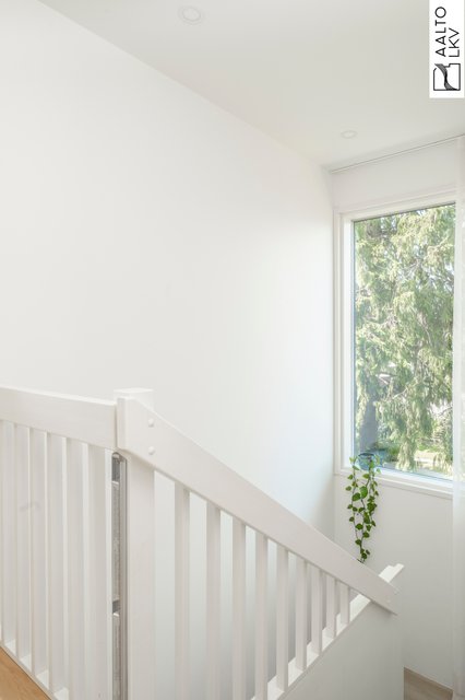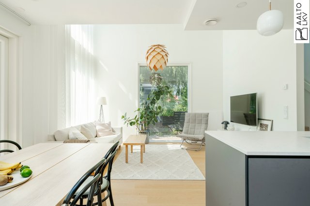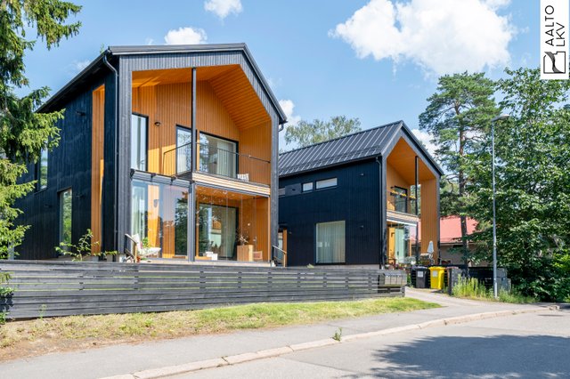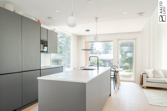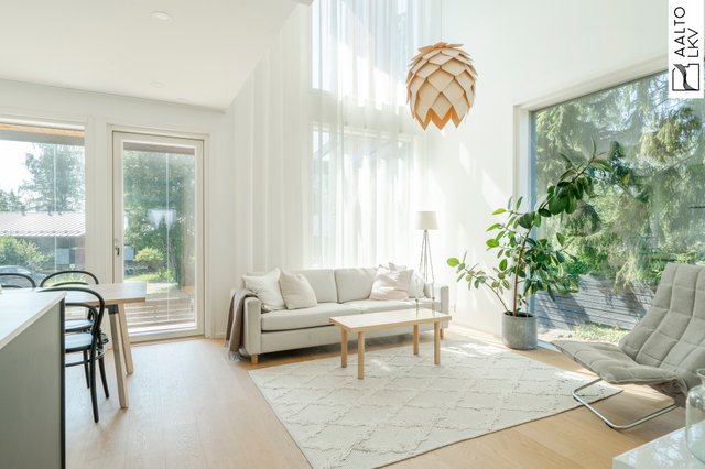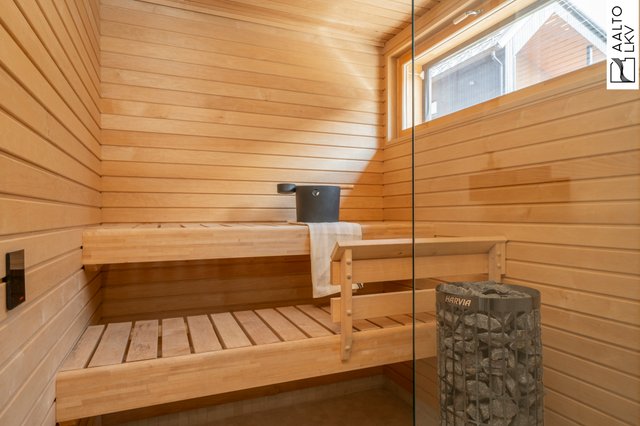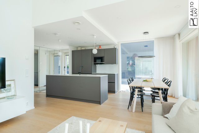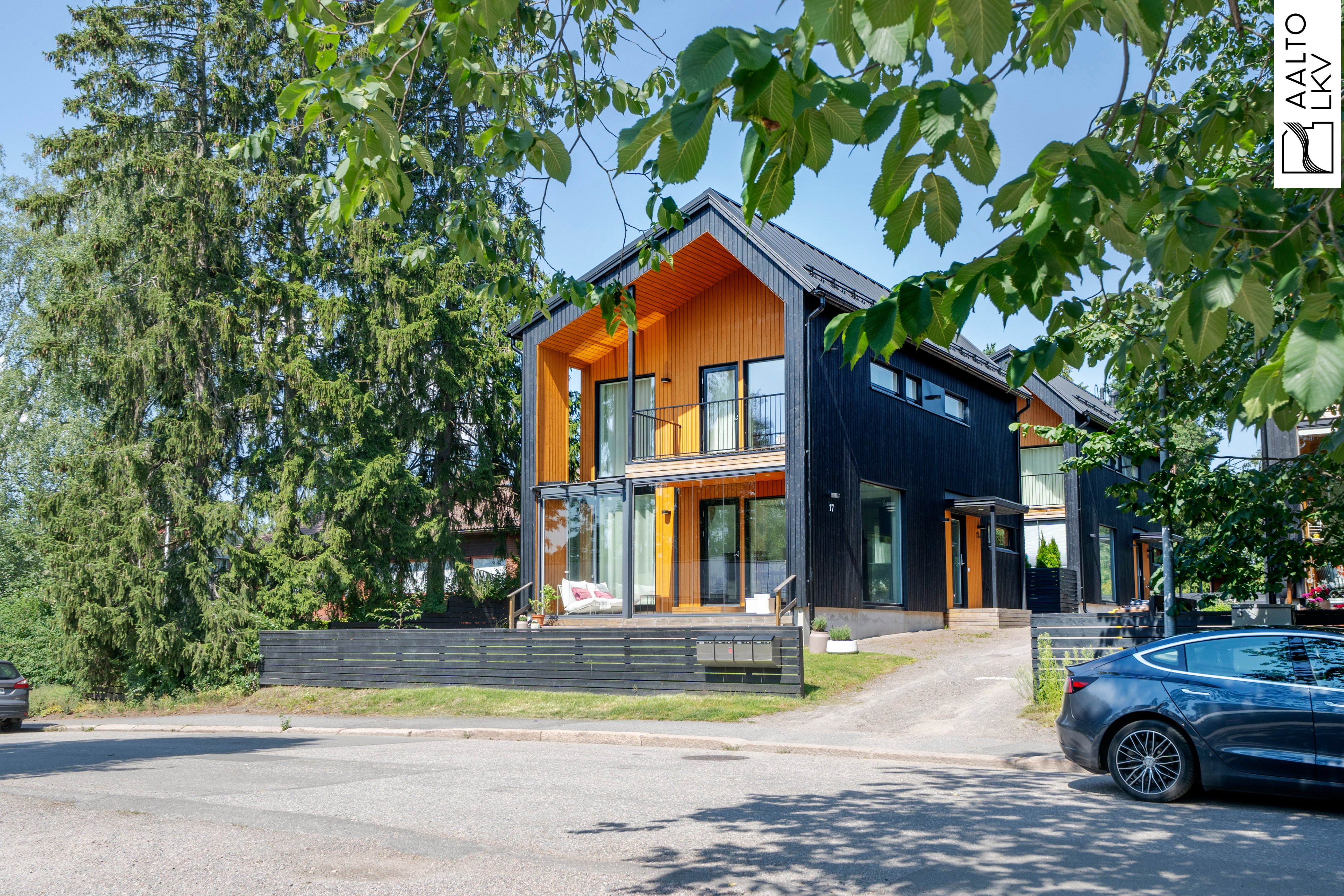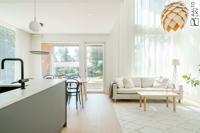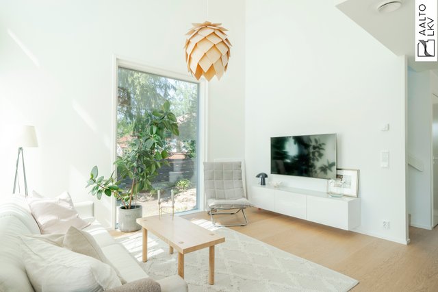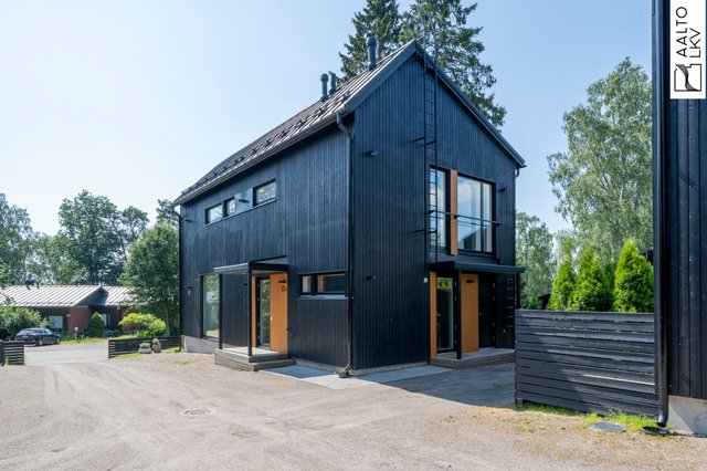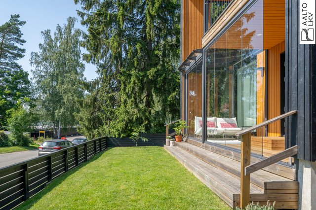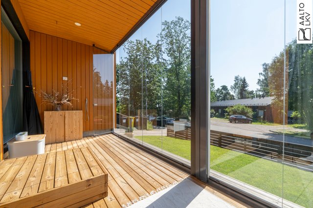 Talossa on avoin ja osittain kahden kerroksen korkuinen olohuone-keittiö-ruokailutila, kolme makuuhuonetta, 2 kylpyhuonetta (toisen yhteydessä kodinhoitotila), sauna, erillinen wc ja lämmin varasto. Talossa on lasitettu, tilava terassi, yläkerrassa parveke sekä kaksi ranskalaista parveketta. Ikkunat ovat korkeat ja pintamateriaalit laadukkaita. Parketit ovat Timberwisen. Keittiön koneet ovat integroidut ja tasot komposiittia. Pihalla on kylmä vaja. Sähköauton latausmahdollisuus.