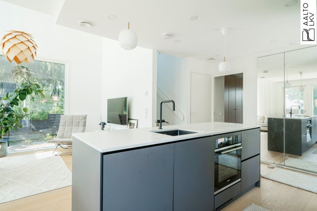 - Jääkaappi, erillinen pakastin, erillisuuni, mikroaaltouuni, liesituuletin, keittiösaareke, ja astianpesukone
