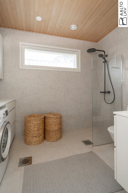- Pesukoneliitäntä, lattialämmitys, pesuallas, lattiakaivo, lastenhoitopöytä/taso, pöytätaso, pyykkikaapit, ja tila pesutornille