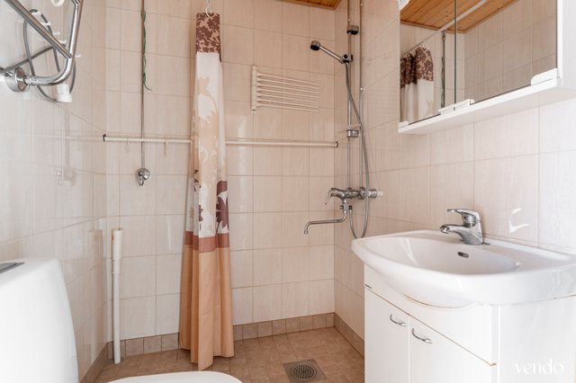 - WC-istuin, suihku, pesukoneliitäntä, peilikaappi, allaskaappi, ja bidee-suihku