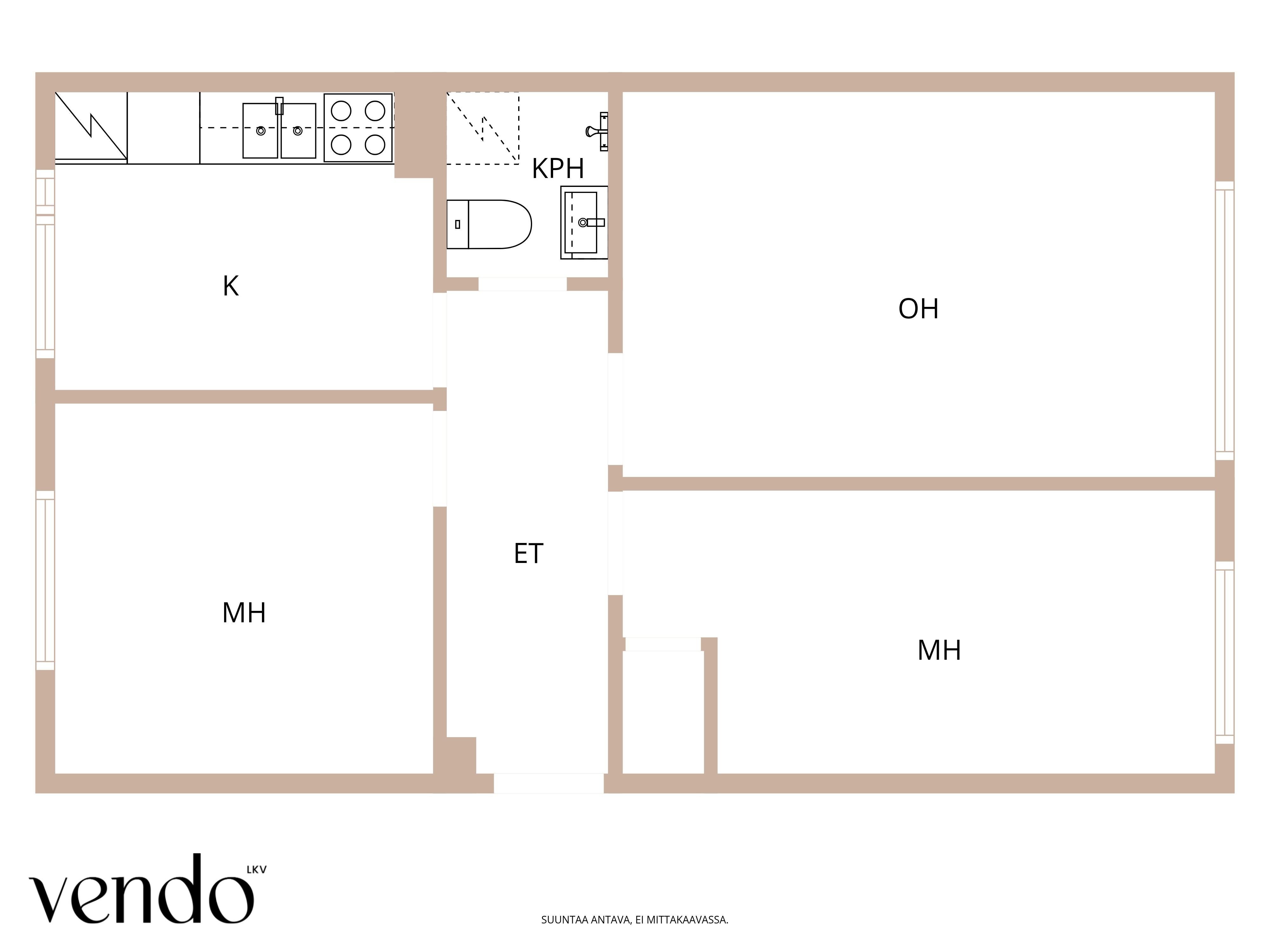 Mellunkylän/Kontulan laidalla 1. kerroksen (ei maantaso) kolmio, avaralla läpitalon pohjaratkaisulla.