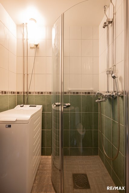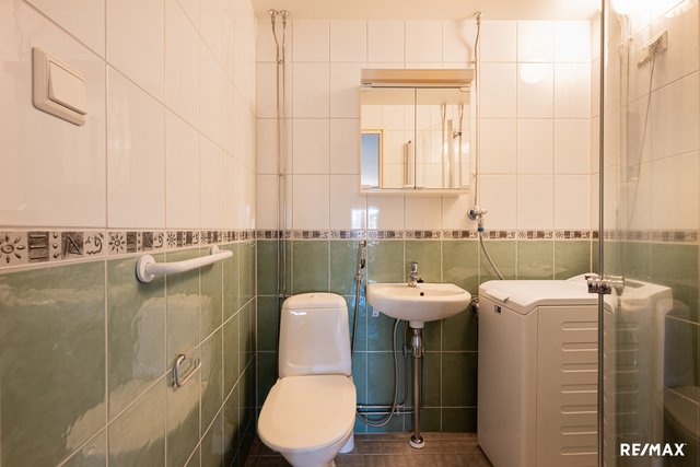 - WC-istuin, suihku, suihkuseinä, pesukoneliitäntä, peilikaappi, ja pesuallas