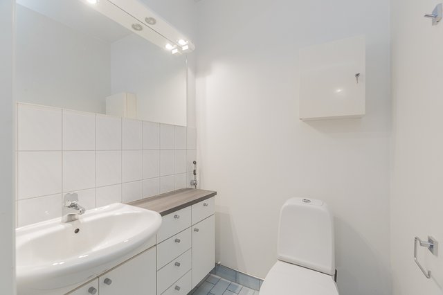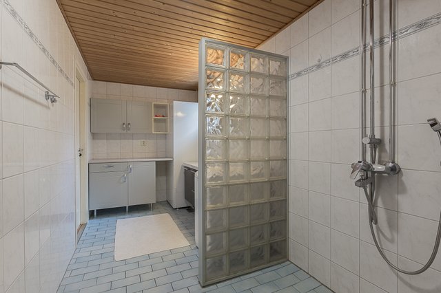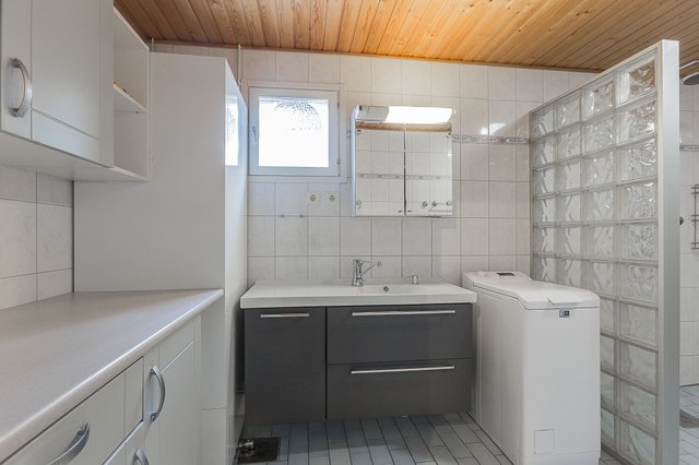 - Lattialämmitys, sadesuihku, lasitiiliseinä, peilikaappi, allaskaappi, ylä- ja alakaapisto, taso, pesukoneliitäntä, lämminvesivaraaja.