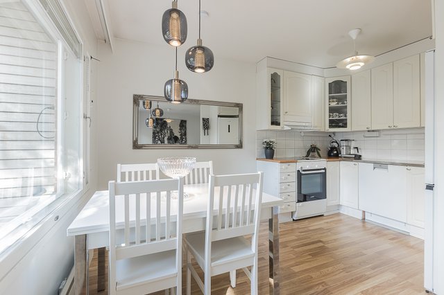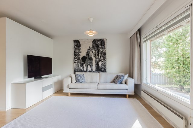 Tässä valoisassa ja muuttovalmiissa vuonna 2000 valmistuneessa kodissa on todella toimiva pohjaratkaisu. Reilunkoinen olohuone ja ruokailutila ovat avaraa tilaa.