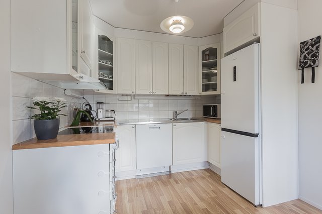- Kaapistot, tasot, integroitu jääkaappi/pakastin, induktioliesi, liesituuletin, astianpesukone. Välitila: Laatta.
