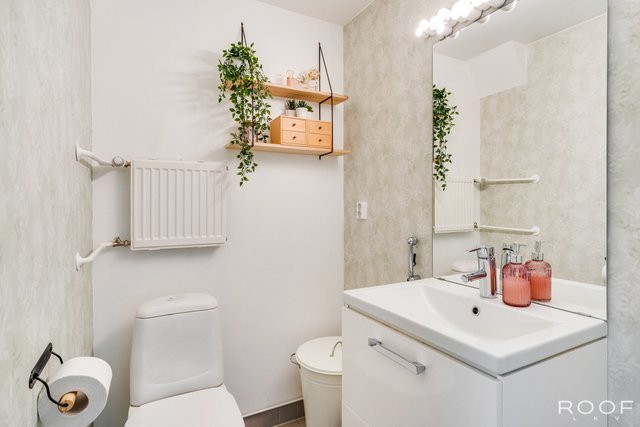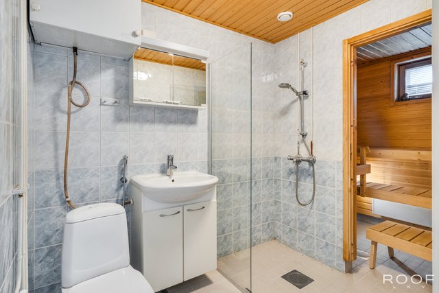 - WC-istuin, suihku, lattialämmitys (sähköllä), pesuallas, allaskaappi, peilikaappi, ja suihkuseinä