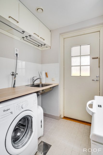- Pesukoneliitäntä, pesuallas, lattialämmitys (sähköllä), pyykkikaapit, tila pesutornille, pöytätaso, ja lattiakaivo