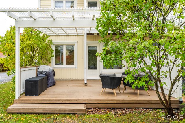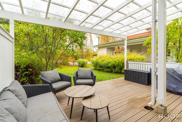 Vuonna 2005 valmistunut koti tarjoaa mukavat puitteet perheelle tai pariskunnalle, joka arvostaa isoa pihaa ja katettua terassia. Pihalla viihtyykin pitkälle syksyyn.