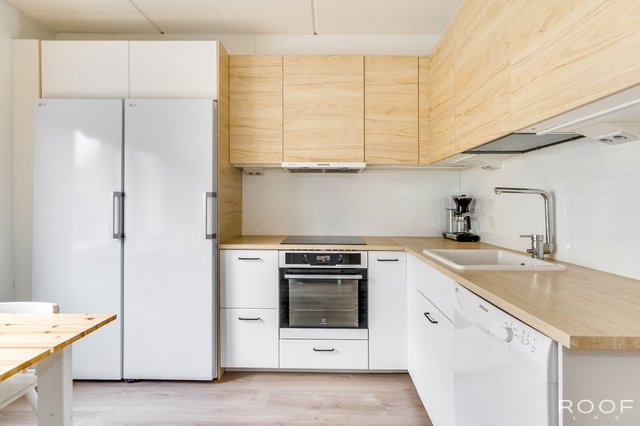 - Erillinen pakastin (uusittu 2025), jääkaappi (uusittu 2025), liesi, liesituuletin (Ilmanvaihtoa säädetään liesituulettimesta), astianpesukone, ja erillisuuni