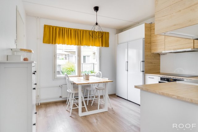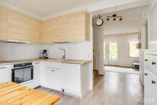 Alakerrassa sijaitseva kaunis keittiö on uusittu vuonna 2020 käytännölliseksi ja toimivaksi. Keittiö avautuu luontevasti olohuoneen suuntaan.