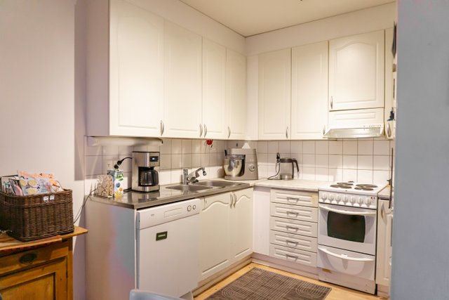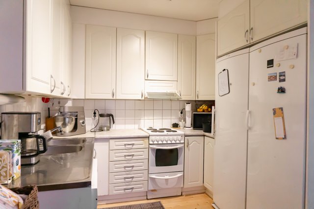 - Jääkaappi (kylskåp), erillinen pakastin (frys), uuni (ugn), liesi (spis), liesituuletin (spisfläkt), ja astianpesukone (diskmaskin)