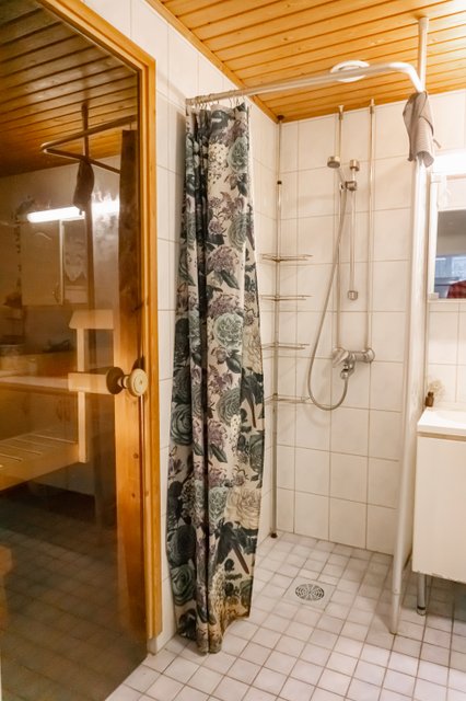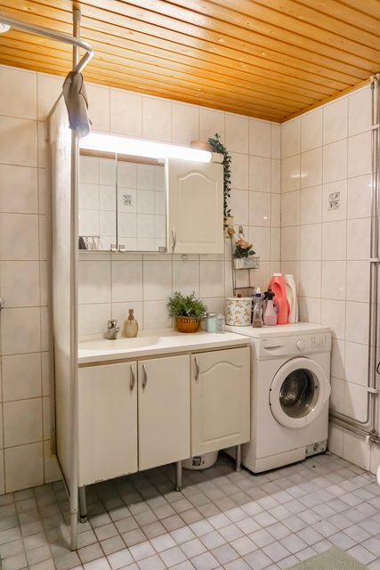 - WC-istuin (wc-stol), suihku (dusch), pesukoneliitäntä (tvättmaskinsanslutning), lattialämmitys (golvvärme), peilikaappi (spegelskåp), ja allaskaappi (lavoar)