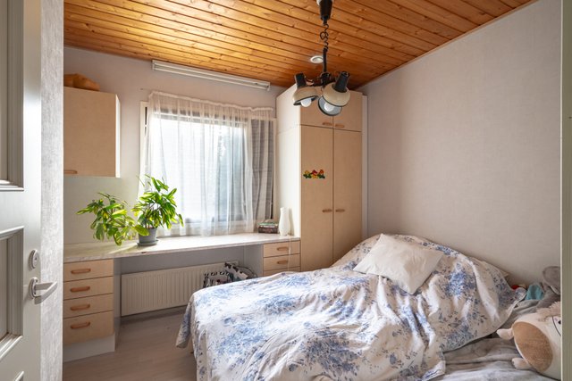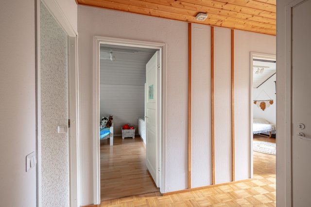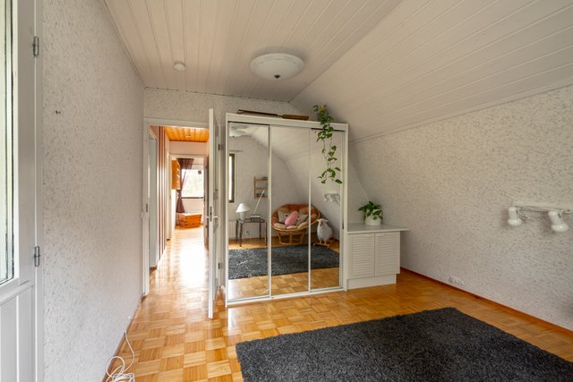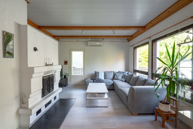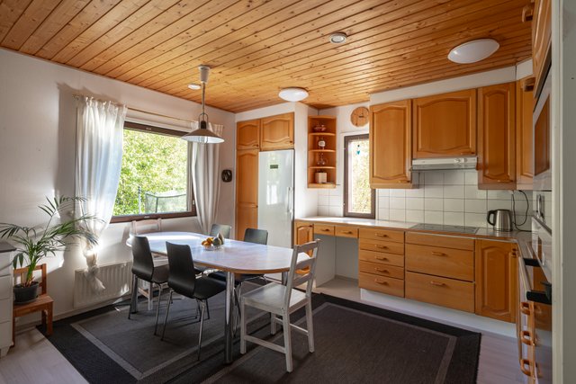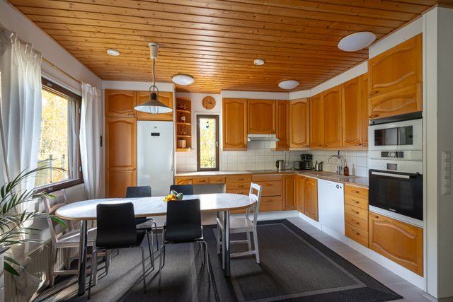 Olohuoneen ja avokeittiön yhdistelmä luo avaran ja valoisan tilan, jossa kaunis varaava takka tuo lämpöä ja tunnelmaa. Neljä makuuhuonetta tarjoavat runsaasti tilaa perheen tarpeisiin, ja sauna kutsuu rentoutumaan kiireisen päivän päätteeksi.