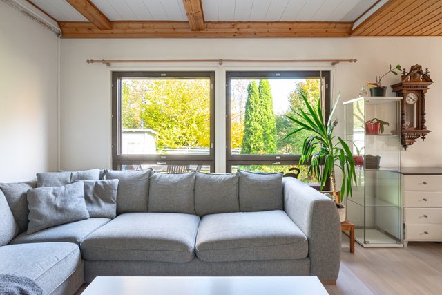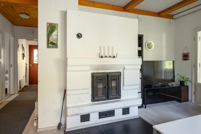 - Olohuone yhdistyy keittiöön ja sen keskipisteenä on kaunis takka. Olohuoneesta on avarat näkymät pihalle.
