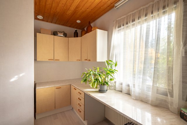 - Avarassa avokeittiössä, joka yhdistyy olohuoneeseen on puiset keittiökaapit.