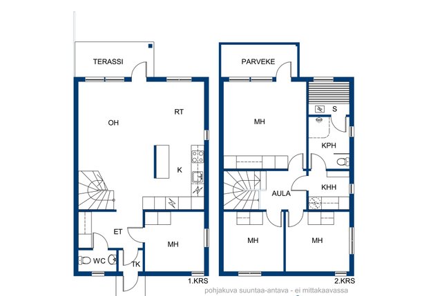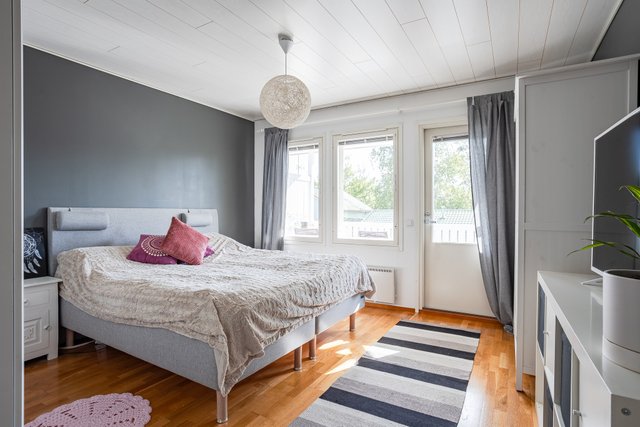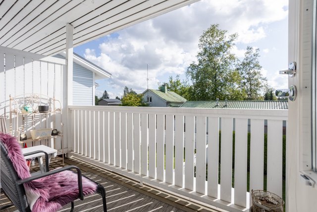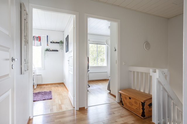 Alakerrassa avarat oleskelutilat, keittiö, erillinen wc ja yksi makuuhuone. Yläkerrassa tyylikäs 2025 remontoitu kylpyhuone, kodinhoitotila ja sauna sekä loput makuuhuoneet, joista isoimmasta käynti parvekkeelle.
