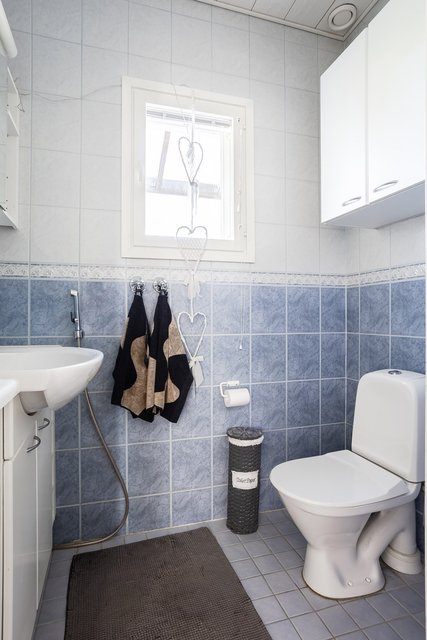 - WC-istuin, suihku, lattialämmitys, allaskaappi, pesuallas, ja bidee-suihku