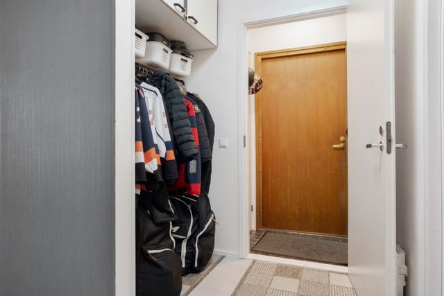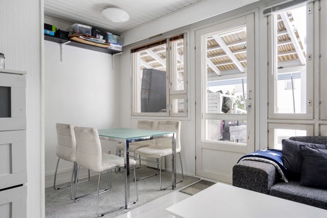 Oma terassi ja piha on mukava lisä tälle asunnolle. Autolle on katospaikka, joten ei huolta parkkeerauksesta. Säilytystilaa tarjoaa oma varasto ulko-oven vieressä sekä asunnon kiinteät kaapistot.