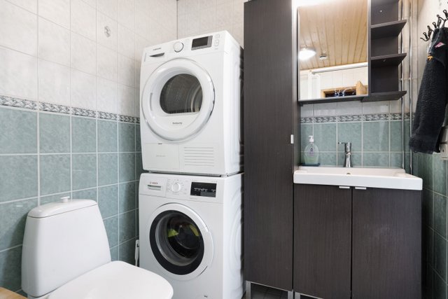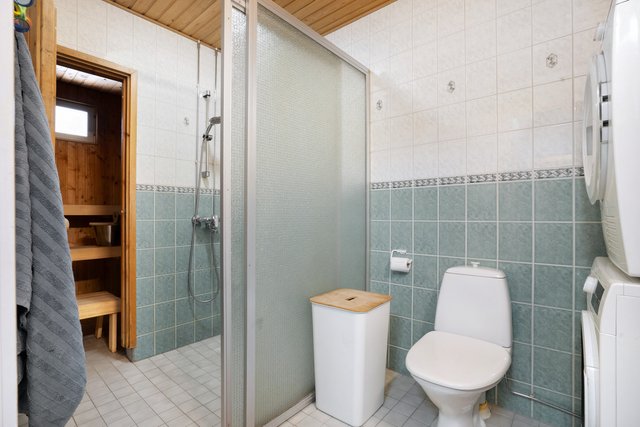 - WC-istuin, suihku, suihkuseinä, pesukoneliitäntä, lattialämmitys, peilikaappi, pesuallas, allaskaappi, ja bidee-suihku