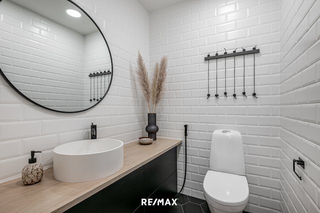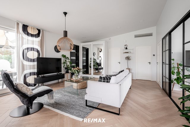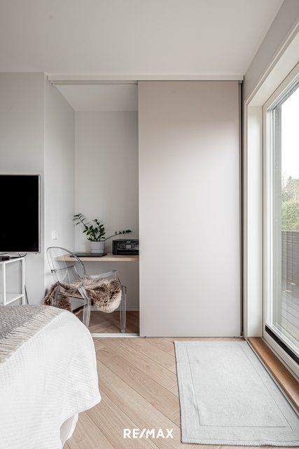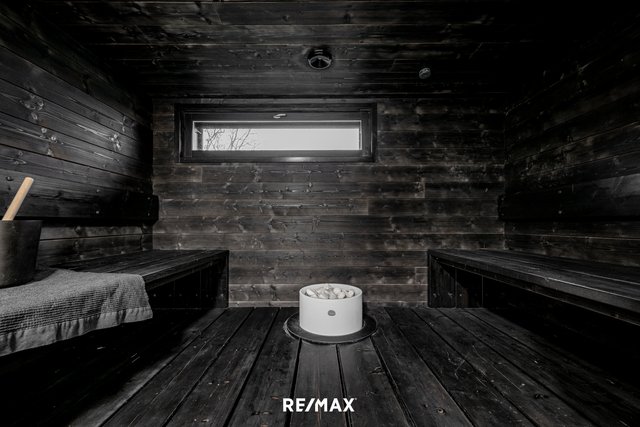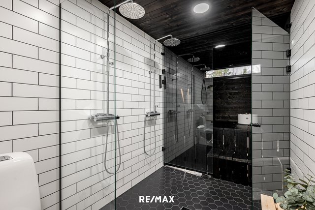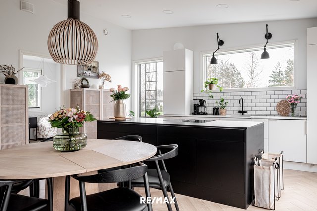 Kodin sydän on näyttävä avoin olohuone-/keittiötila, jossa suuret ikkunat tuovat luonnonvalon sisään ja tekevät tilasta poikkeuksellisen ilmavan. Lisäksi päämakuuhuone hurmaa tilan lasisella liukuovi seinällään.