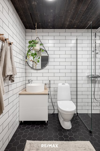 - WC-istuin, suihkuseinä, peili, pesuallas, allaskaappi, lattialämmitys, bidee-suihku, ja 2x suihku