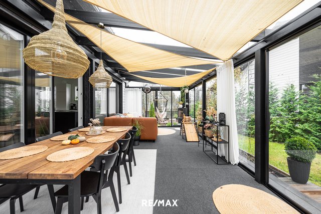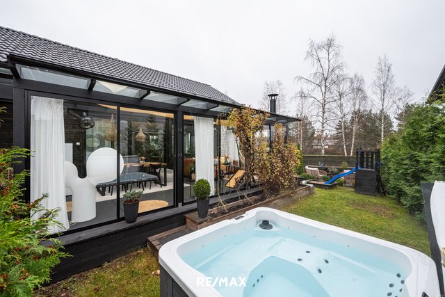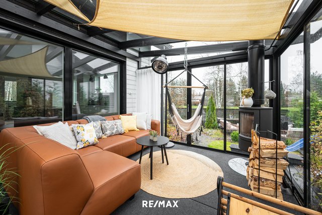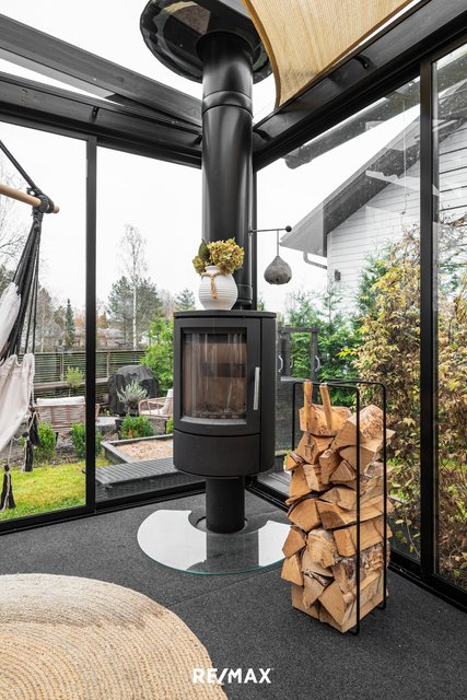 Tilava ja huolellisesti toteutettu lasitettu terassi laajentaa oleskelutiloja ulos liukuovien ansiosta. Lasitetulla terassilla takkatulen ääressä on helppo nauttia tunnelmallisista illoista aikaisesta keväästä pitkälle syksyyn saakka. Pihapiiri tarjoaa paljon elämyksiä ja rentoutumismahdollisuuksia: