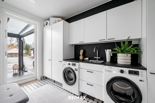- Pesukoneliitäntä, lattialämmitys, pöytätaso, pesuallas, pyykkikaapit, ja lattiakaivo