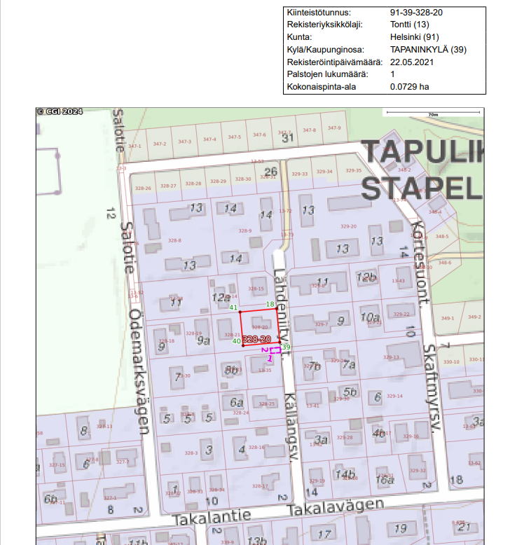 - Maankäyttöjohtaja päätti hyväksyä 39. kaupunginosan (Tapaninkylä) korttelin 39328 tonttia 20 koskevan poikkeamishakemuksen 22.4.2022. Hakemuksen mukainen hanke edellyttää poikkeamista asemakaavasta nro 7540 seuraavasti: - Tonttitehokkuus saa nousta luvusta e=0,20 lukuun e=0,25, ylitys on 36 k-m2 (25 %). - Siltä osin kun ulkoseinien paksuus on enemmän kuin 250 mm, kerrosala voidaan ylittää MRL 115 § 3 momentissa esitetyn periaatteen mukaisesti. - Teknisten tilojen osalta kerrosala voidaan ylittää MRL 115 § 3 momentissa esitetyn periaatteen mukaisesti. - Kaksikerroksisen rakennuksen enimmäiskorkeus (6 m) saadaan ylittää siten, että asuinrakennuksen enimmäiskorkeus on 7,15 m. - Autokatoksen enimmäiskorkeus (2,5 m) saadaan ylittää siten, rakennuksen enimmäiskorkeus on noin 3,5 m. - Tontin sisäänajoaukon enimmäisleveys (3,5 m) saadaan ylittää noin 0,5 m. Maankäyttöjohtaja päätti myöntää poikkeamisen seuraavilla ehdoilla: - Rakennus rakennetaan kahteen tasoon (enintään 70 % kerrosalasta yhdessä tasossa). - Autosuoja-, varasto- ja talousrakennustilaa saadaan rakentaa enintään 25 m2 asuntoa kohden kerrosalan estämättä. - Tontille saa rakentaa enintään kaksi asuntoa. - Asuinhuoneiden ulkokuoren ääneneristävyyden AL lentomelua vastaan on oltava vähintään 32 dB. - Autopaikkoja on rakennettava 1 ap/asunto ja lisäksi 1 ap/asunto auton tilapäistä säilyttämistä varten.