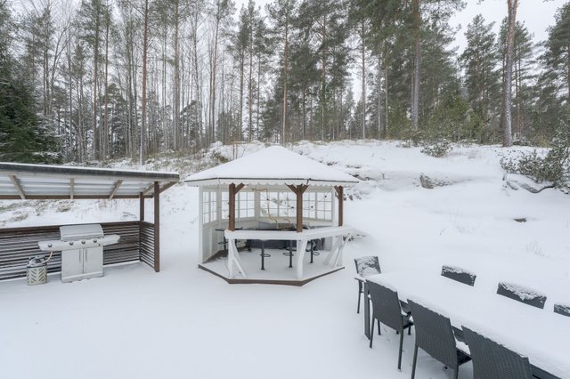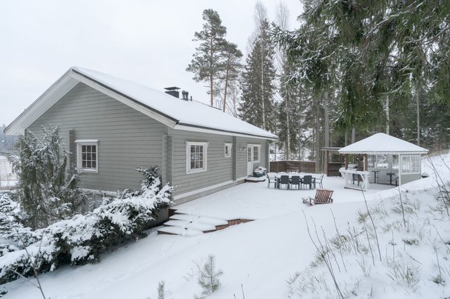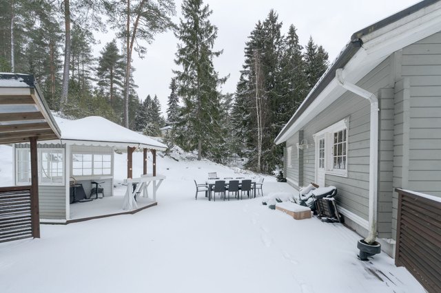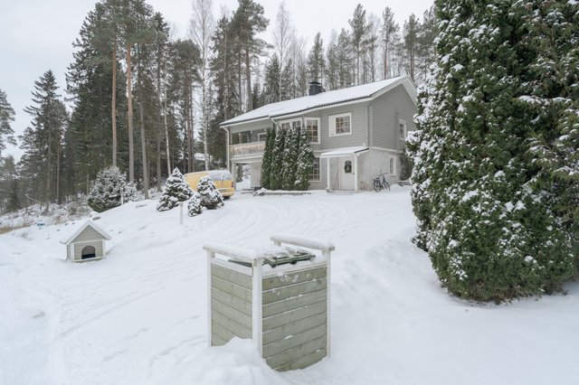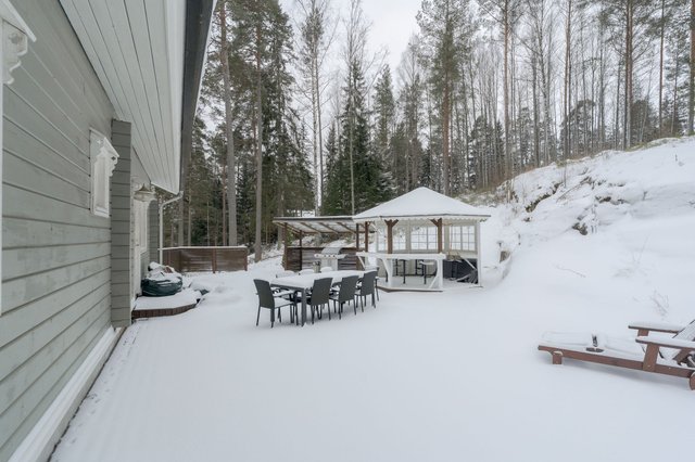 Ulkotilat ovat vertaansa vailla – suuri 1590 m² tontti tarjoaa runsaasti tilaa lasten leikeille ja puutarhanhoidolle. Pihalta löytyy huvimaja, grillikatos ja leikkimökki, jotka tekevät kesäpäivistä erityisen nautinnollisia. Lisäksi talossa on parveke ja suojaisa terassi, joilta avautuvat upeat näkymät ympäröivään luontoon.