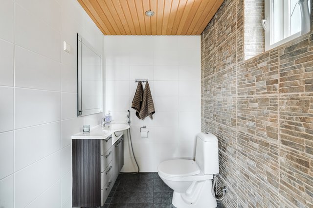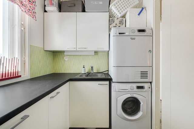 - Pesukoneliitäntä, lattiakaivo, pöytätaso, tila pesutornille, lattialämmitys, pesuallas, ja pyykkikaapit