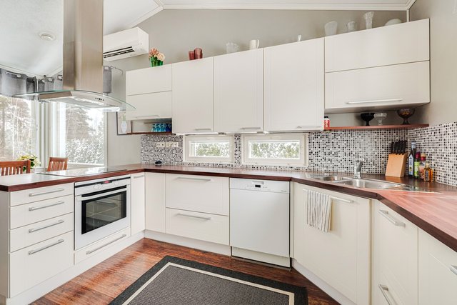 - Jääkaappi, erillinen pakastin, erillisuuni, liesi, liesituuletin, keittiösaareke, ja astianpesukone (Uusittu (2022 Miele))