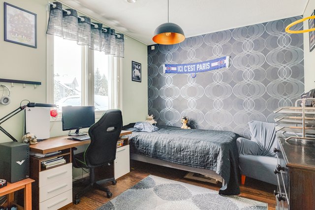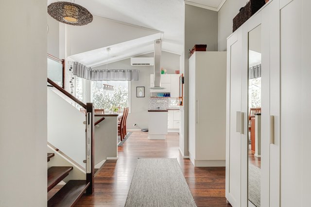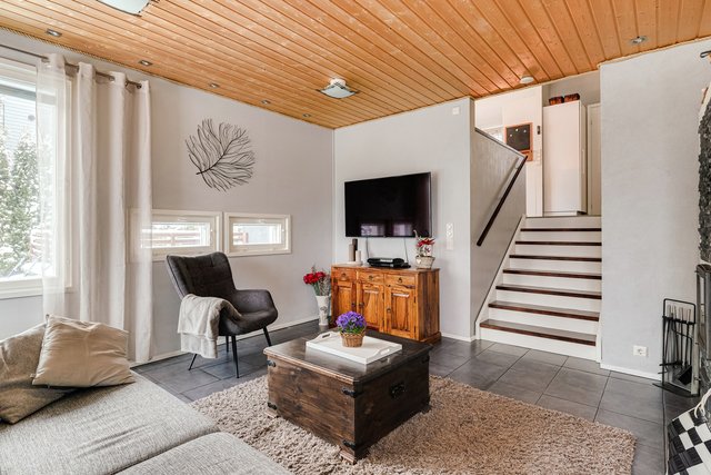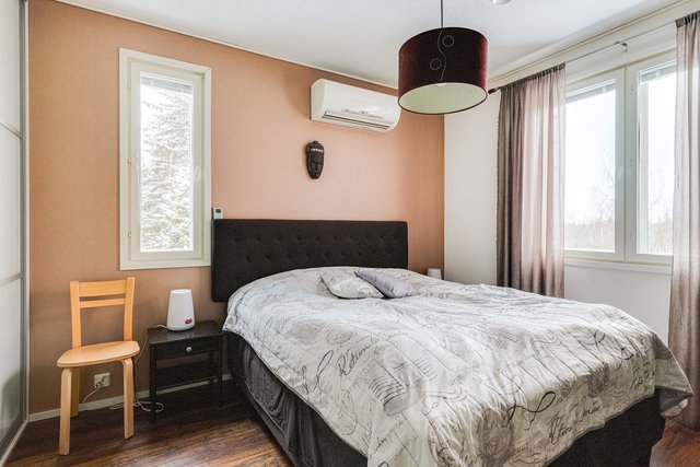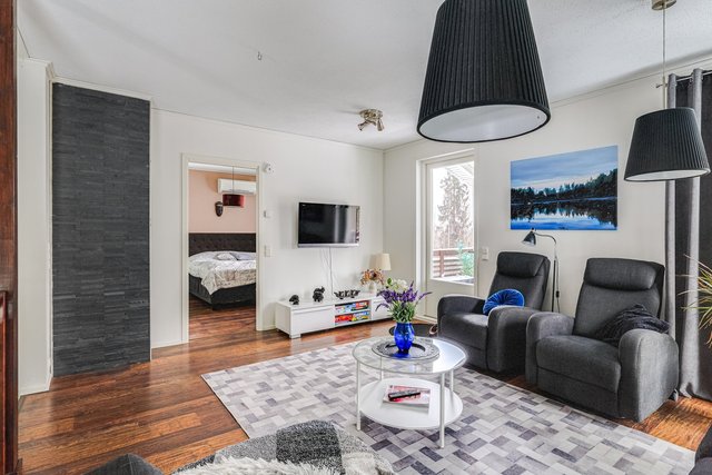 Ensimmäisessä kerroksessa on kaksi makuuhuonetta, moderni avokeittiö, wc sekä kodinhoitohuone. Muutama rappunen ylös päin on yksi makuuhuone jossa oma ilmalämpöpumppu joka mukavasti viilentää kuumina kesäpäivinä samassa kerroksessa olohuone josta näkymä keittiöön ja pääsy parvekkeelle.