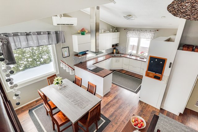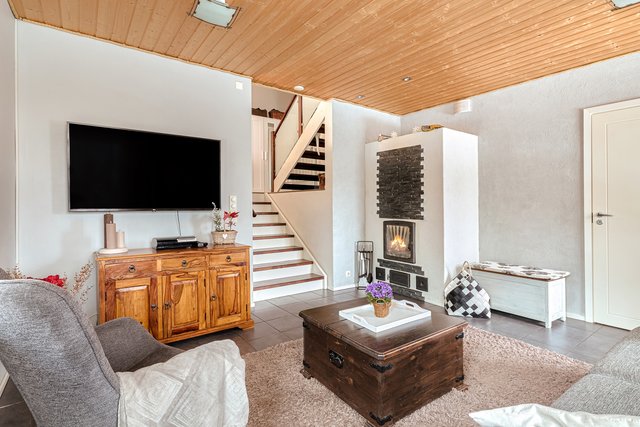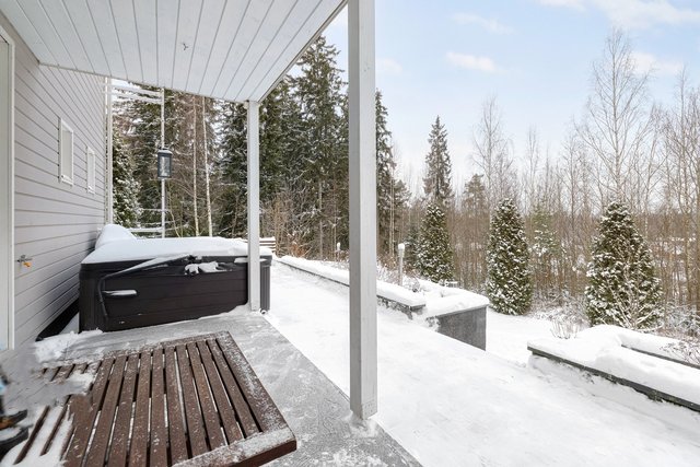 Kaiken kruunaa talon lämmitysjärjestelmä joka on energiatehokas ilmavesilämpöpumppu vesikiertoisella lattialämmityksellä. Vuonna 2024 asennetut 18 aurinkopaneelia pitävät sähkölaskut kurissa.