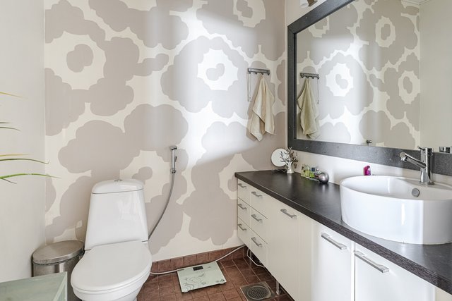 - WC-istuin, suihku, poreamme, pesuallas, bidee-suihku, allaskaappi, ja peili