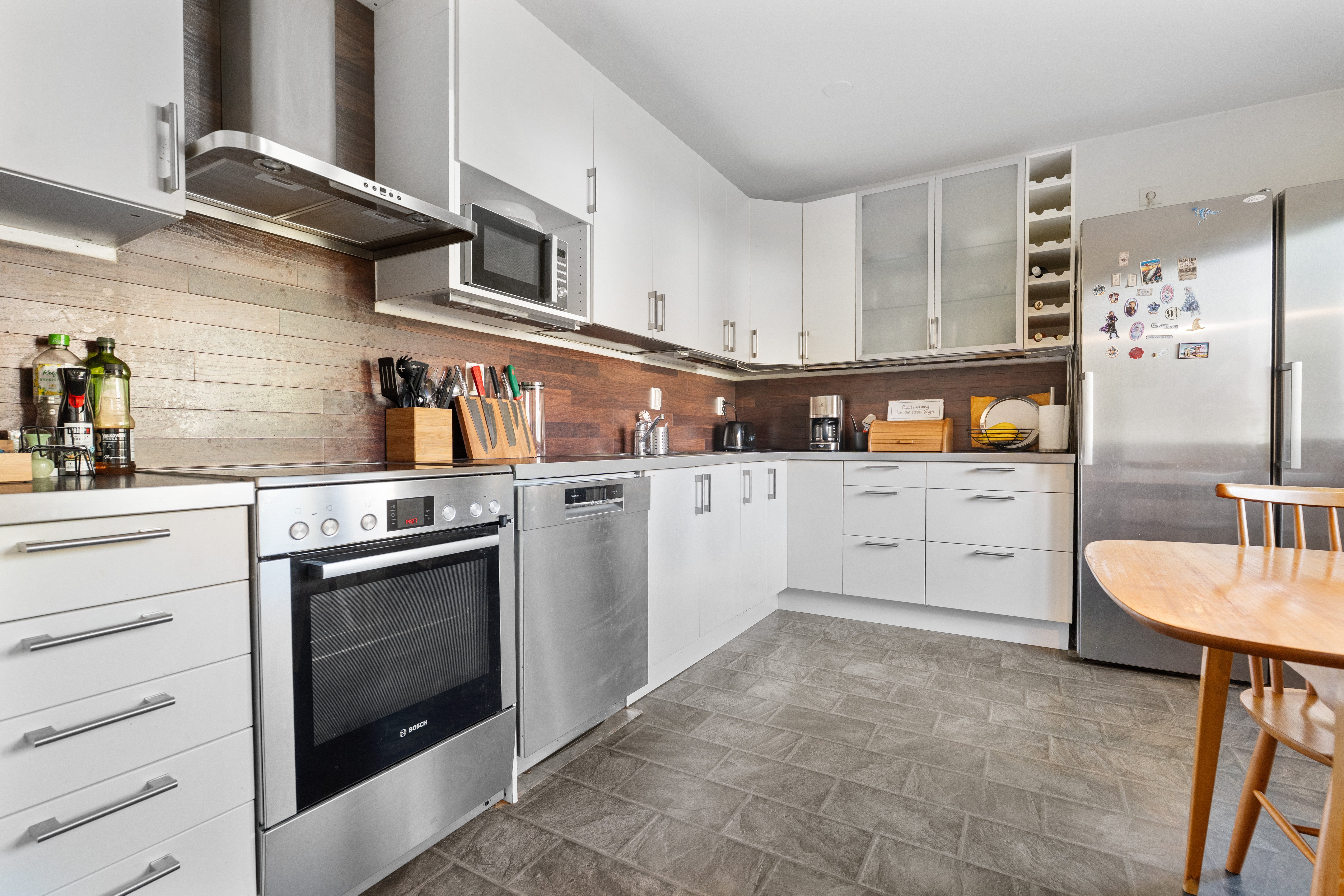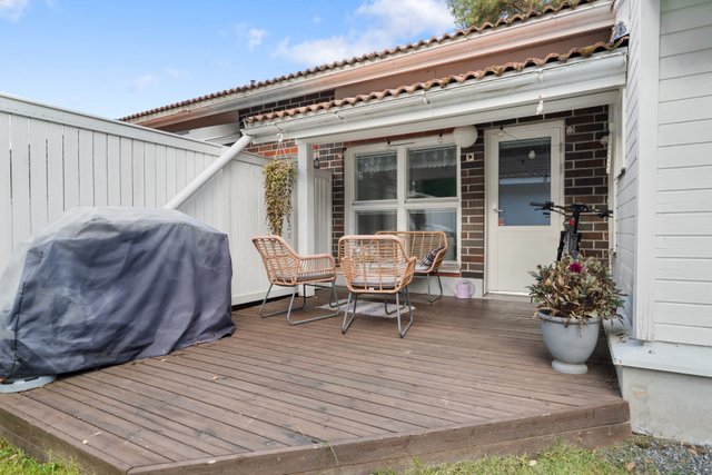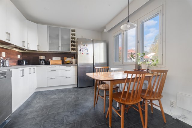 Bostadens hjärta är det renoverade och praktiska köket som ger goda förutsättningar både för vardagsmatlagning och helgens middagar. Från det rymliga vardagsrummet finns utgång till den egna gården – en härlig plats att njuta av, solig gård.