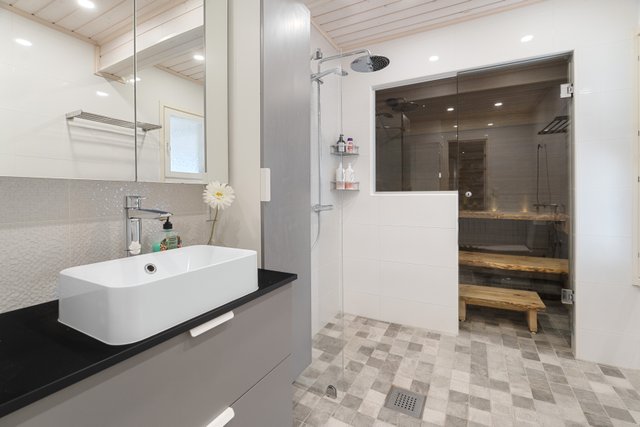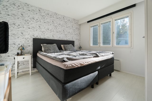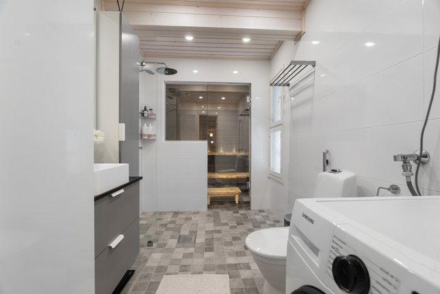 Kylpyhuone on uusittu vain pari vuotta sitten, ja sen yhteydessä on oma sauna lasiseinineen – täydellinen paikka rentoutumiseen. Kaksi makuuhuonetta tuovat joustavuutta asumiseen ja sopivat niin perheelle, pariskunnalle kuin yksinasuvallekin.