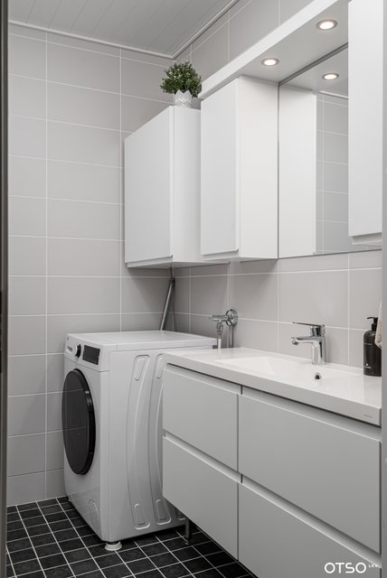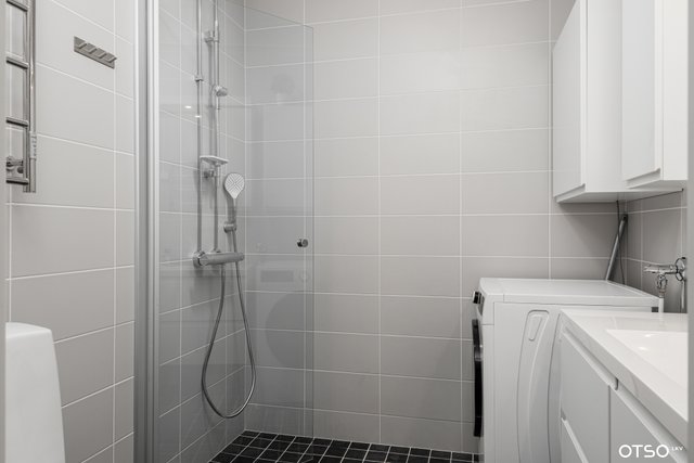 - WC-istuin, suihku, suihkuseinä, pesukoneliitäntä, peili, pesuallas, allaskaappi, bidee-suihku, ja pyyhekuivain