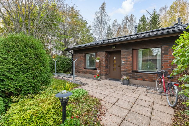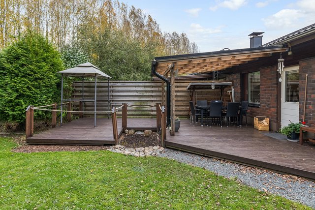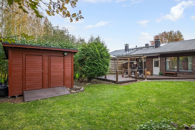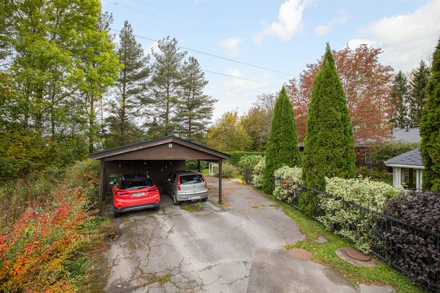 - Etupihalla sijaitsee käytännöllisesti sijoitettuna autokatos. Autokatoksen ja sen yhteydessä olevan varaston takaa avautuu asunnon etupiha, joka sekin on suojaisa ja naapureilta piilossa. Erityisesti rauhaa tuo kuitenkin talon takapiha. Takapiha on aidalla suojattu tällä puolella olevan ainoan naapurin suuntaan. Muuten naapureita ei ole edessä, eikä sivulla. Täällä vietät aikaa täysin omassa rauhassa. Puutarha on kaunis, erittäin hyvin suunniteltu ja hoidettu. Asunnon isolta terassilta on sujuva pääsy puutarhaan nurmialueen kautta. Pihasta löytyy hienoja istutuksia ja isohko puutarhavaja, johon mahtuu hyvin vaikka seuraavan talven polttopuut ja kaikki puutarhavälineet.