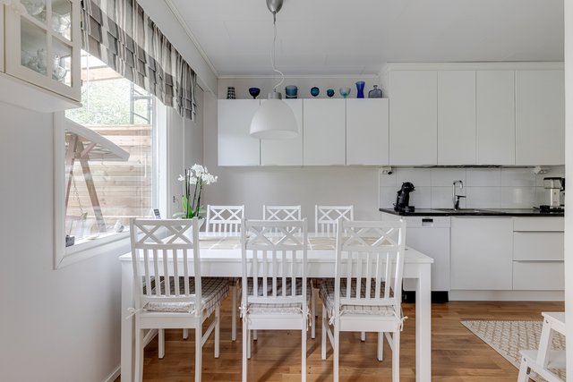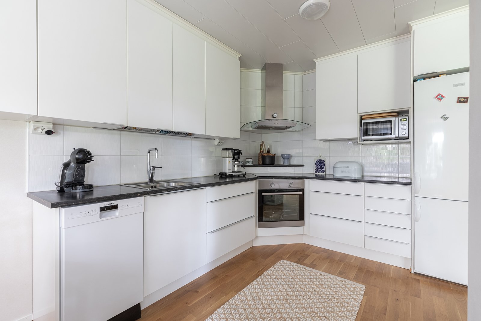 - Nykyaikainen ruokailutilaan ja olohuoneeseen avautuva keittiö.