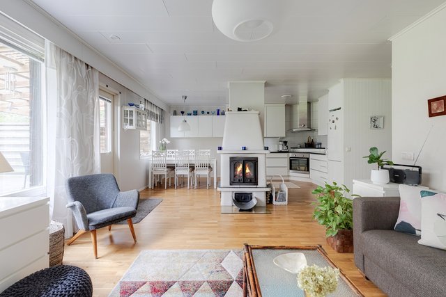 - Olohuone sijaitsee käytännöllisesti ruokailutilan ja keittiön yhteydessä. Olohuoneessa, talon sydämessä, on varaava takka. Takka jakaa tehokkaasti lämpöä koko asuntoon.
