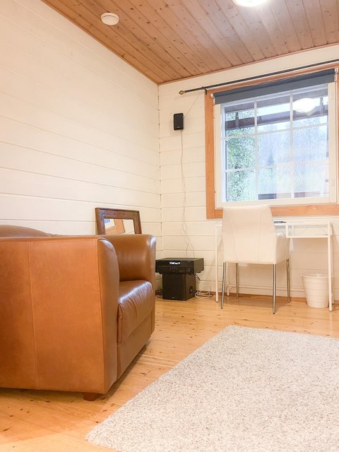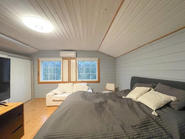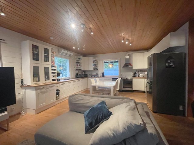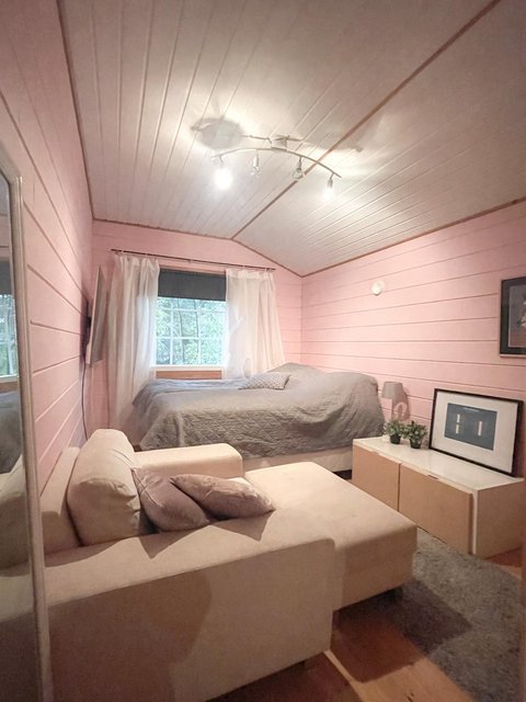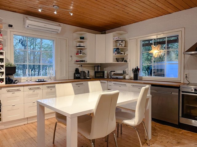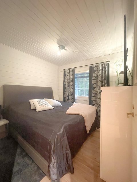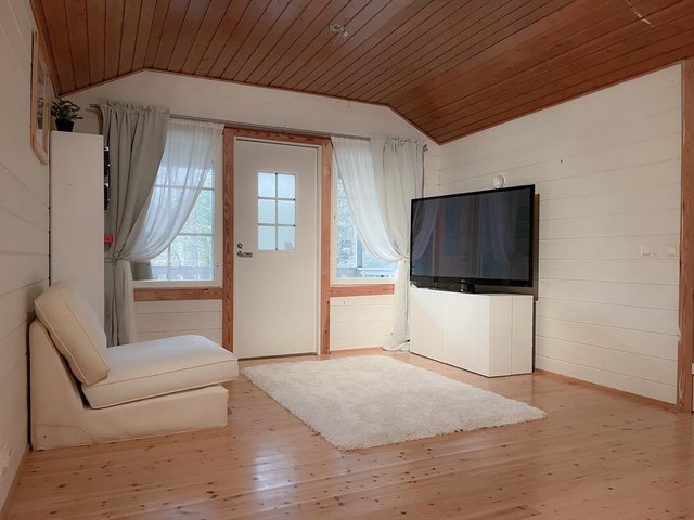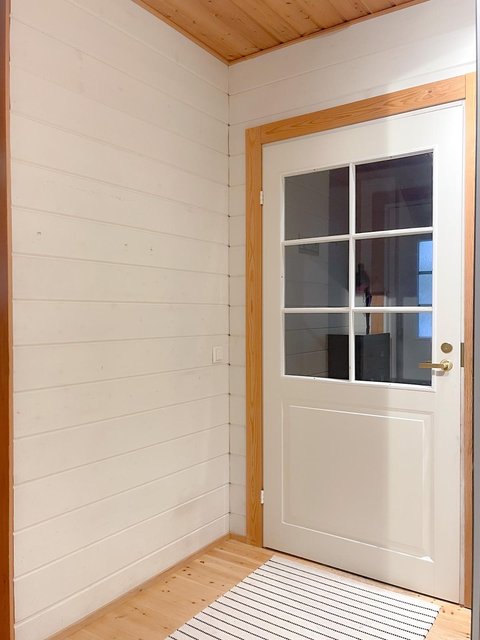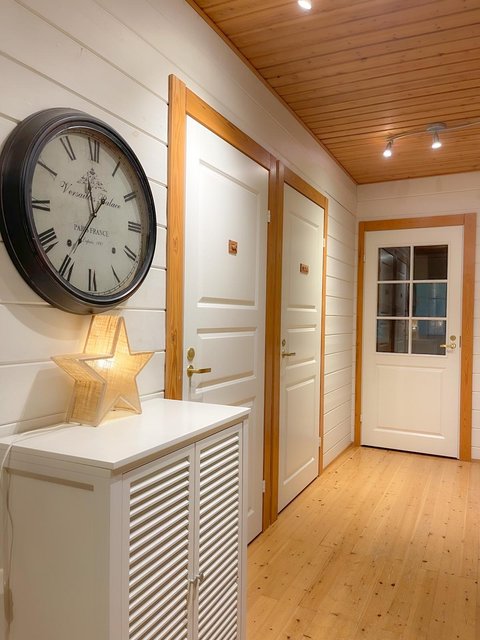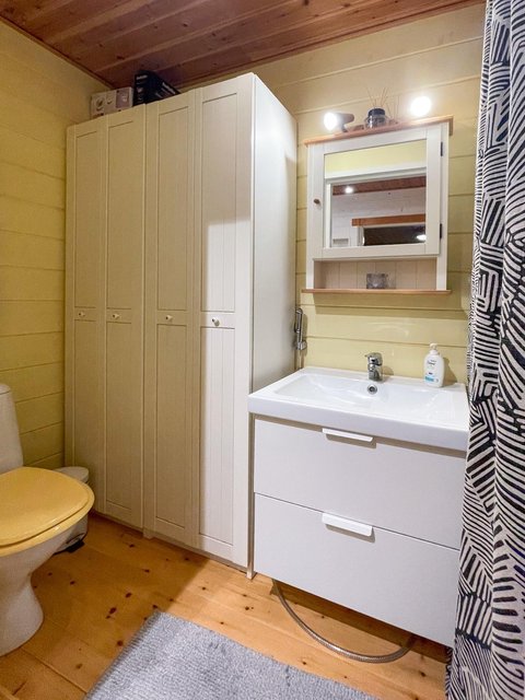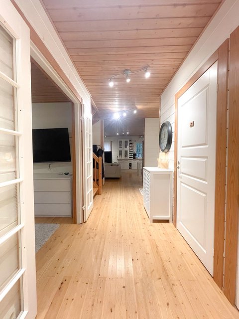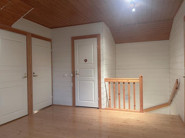 - Pintamateriaalit: Seinät hirsipaneelia, lattiat lautaa, kosteatilat laattaa