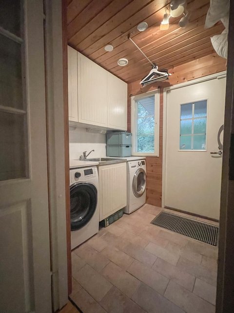- Kodinhoitohuoneessa paikka pesukoneelle ja kuivausrummulle. Lavuaari ja kurasyöppö, ovi terassille. Jääkaappi ja pakastin löytyy myös, vanhat mutta olleet toimivat.