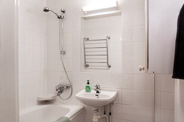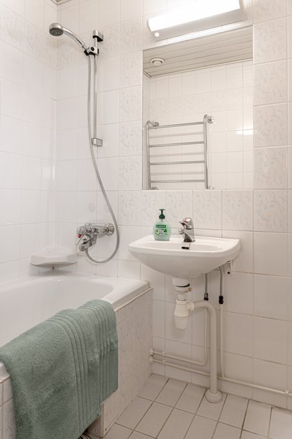 - Pesukoneliitäntä, peili, kylpyamme, pesuallas, rättipatteri, ja suihku