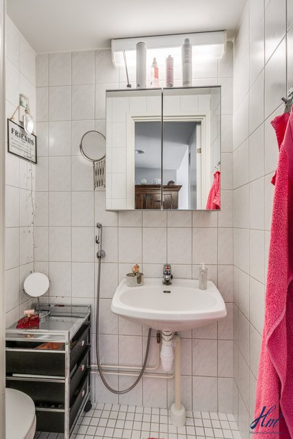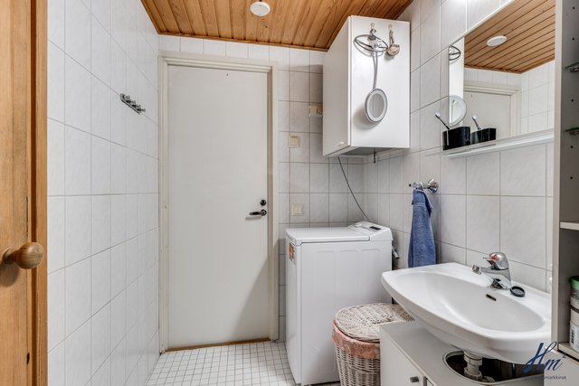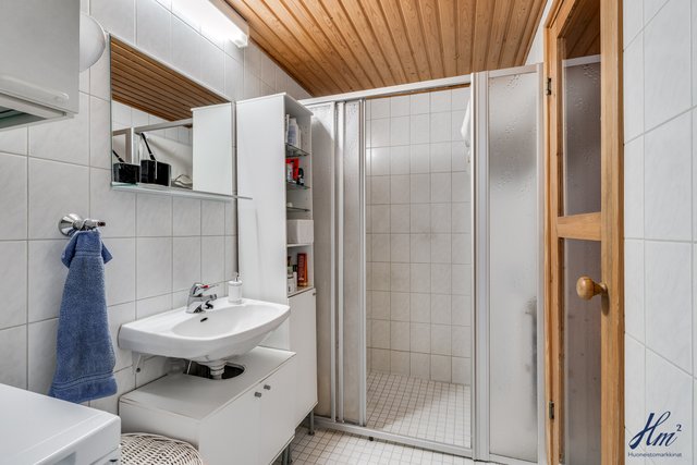 - Suihku, suihkuseinä, pesukoneliitäntä, peili, ja allaskaappi